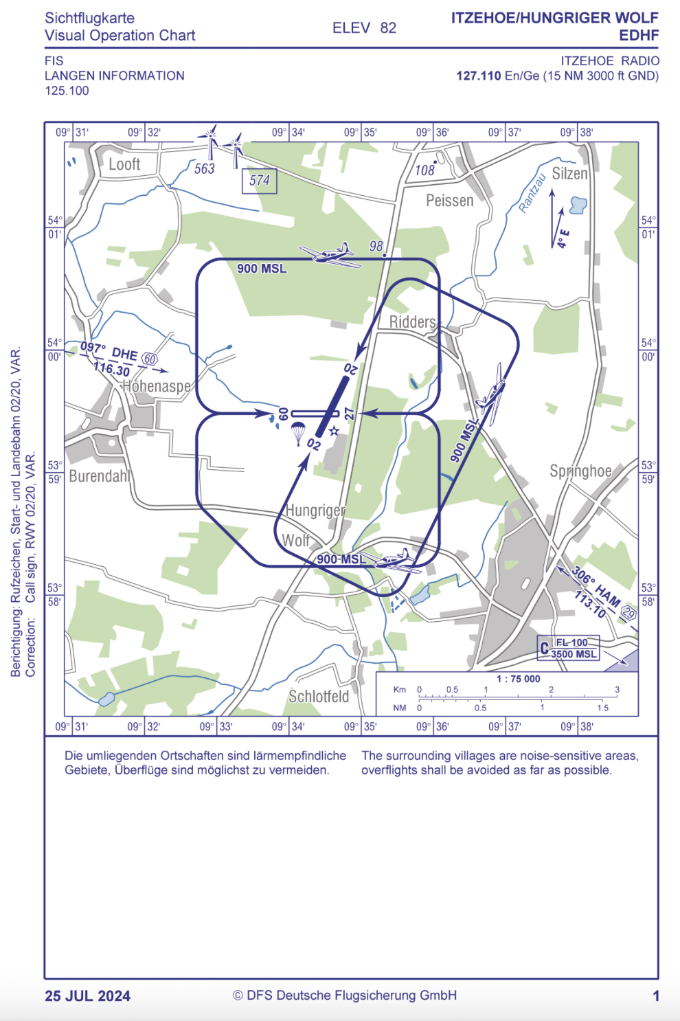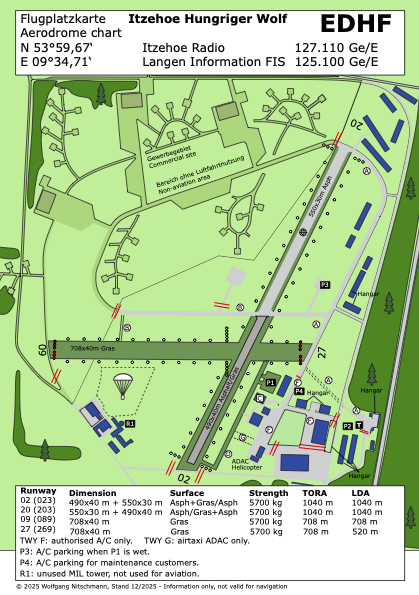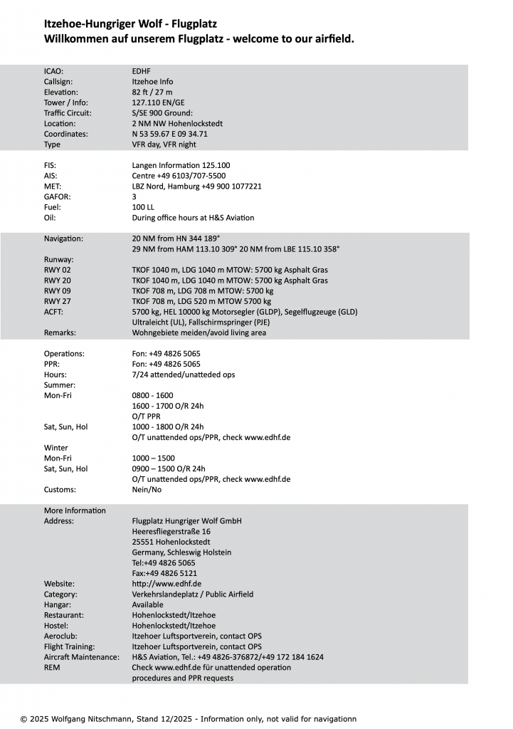 Der Verkehrslandeplatz Itzehoe (Hungriger Wolf) liegt nordwestlich der Kontrollzone von Hamburg und ist damit navigatorisch schnell und gut zu erreichen. Informationen bieten die offiziellen Dokumente der AIP oder andere Hilfestellungen wie OpenAIP bzw. unsere hier zusammengestellten Dokumente.